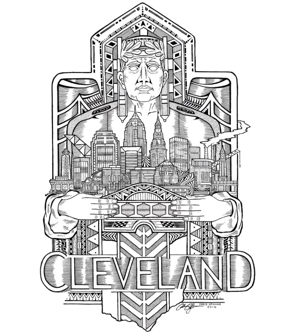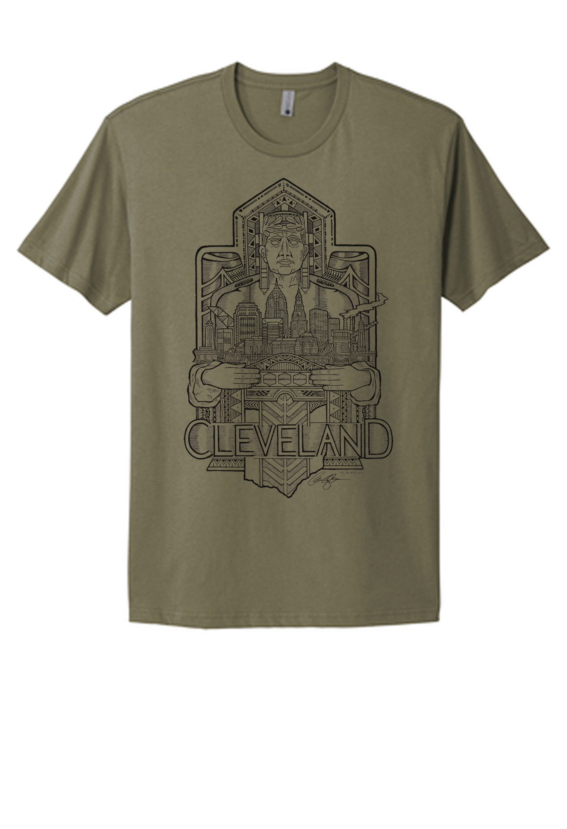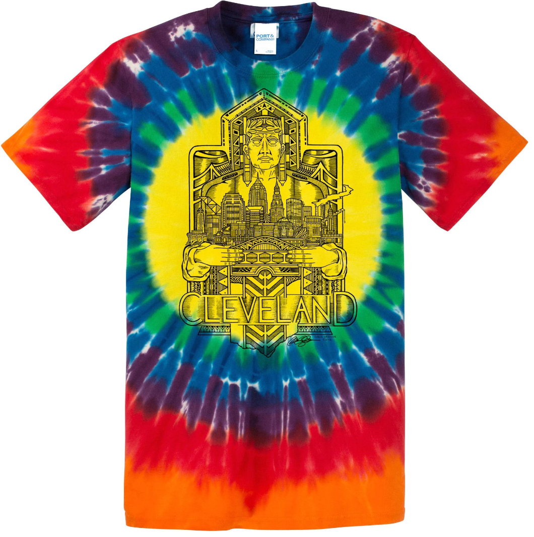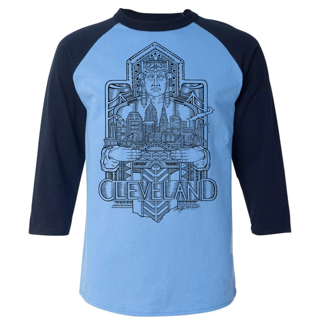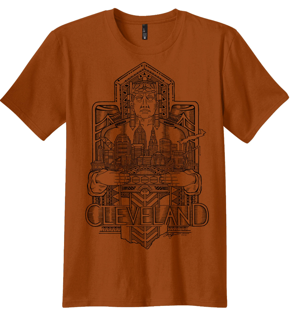These Shirts are hand printed in black ink with my Cleveland Guardian of Transportation drawing. The drawing features one of the guardians from the Hope Memorial bridge with the Cleveland skyline in his hands. In the foreground is the Detroit-Superior bridge and below are patterns based on the architecture of the guardian ending in the shape of Ohio at the bottom. This took me approximately 20 hours to draw.